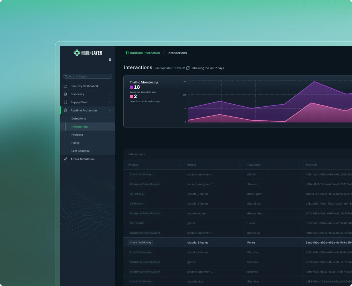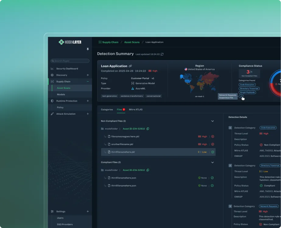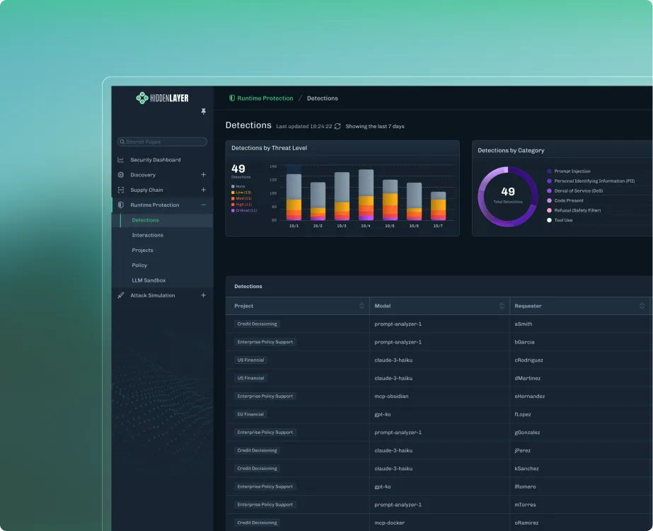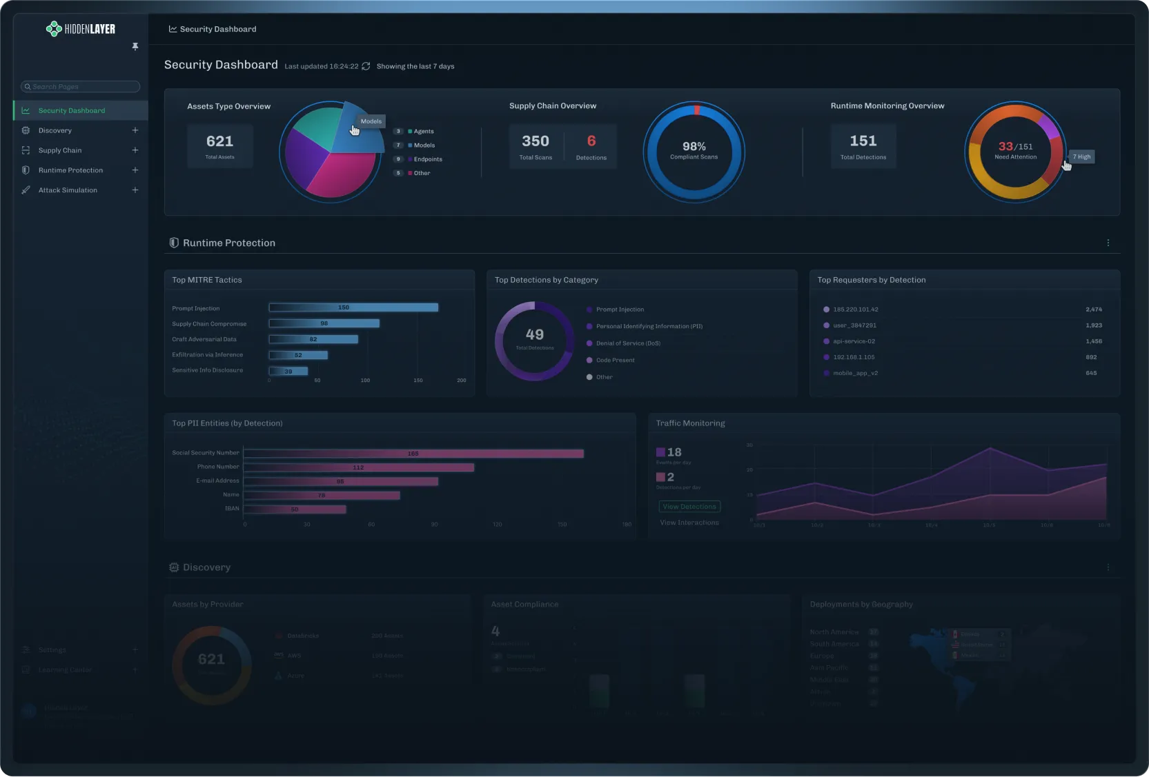 The HiddenLayer AI Security Platform secures agentic, generative, and predictive AI applications across the entire lifecycle, protecting IP, ensuring compliance, and enabling safe adoption at enterprise scale.