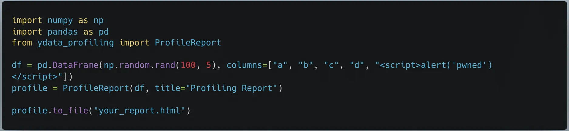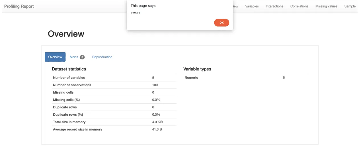An attacker can create a maliciously crafted Ydata-profiling html report containing malicious code. Once a victim browses to the report and views it, malicious code will execute in their browser.