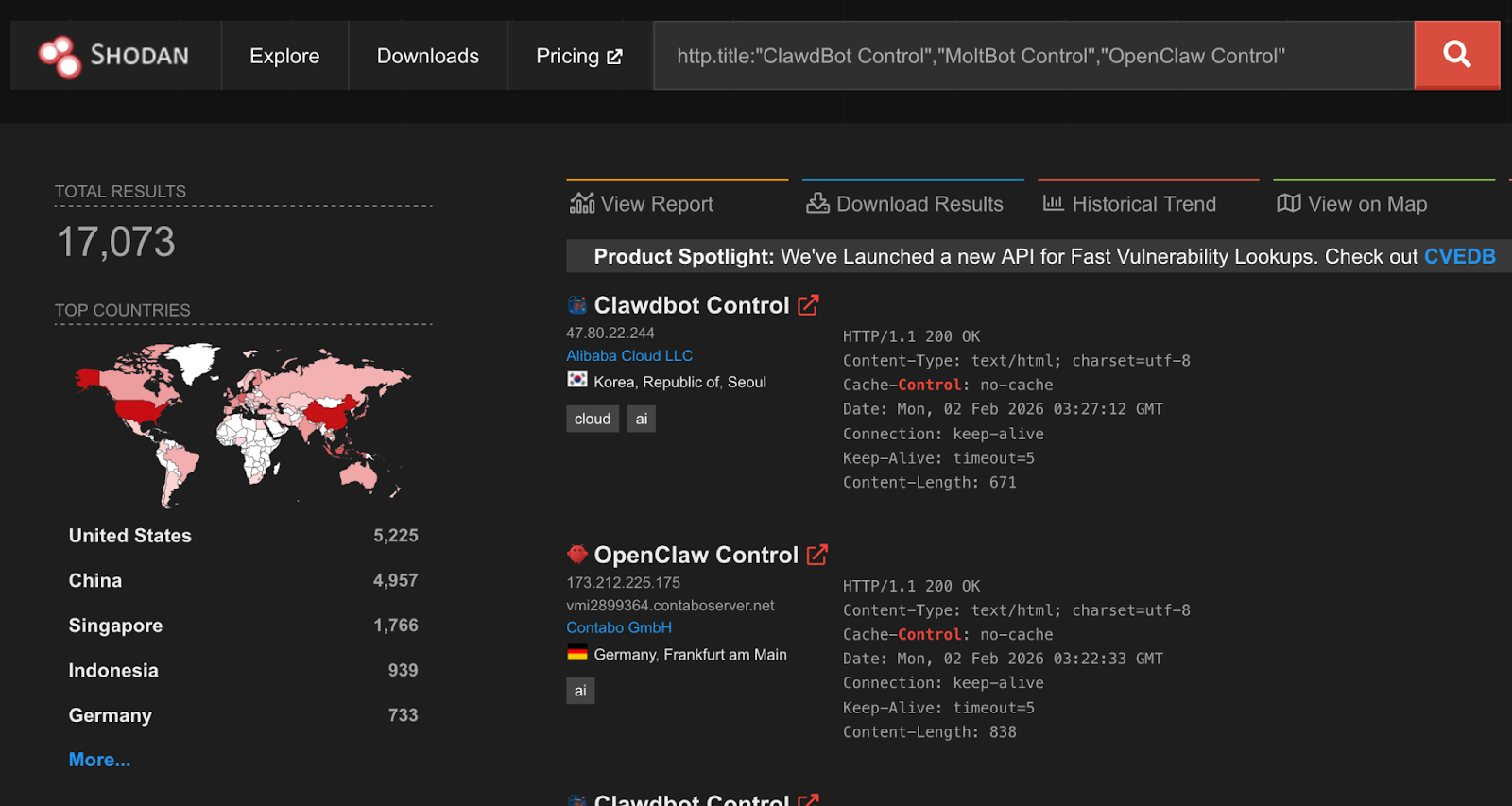 OpenClaw also uses mDNS and DNS-SD for gateway discovery, binding to 0.0.0.0 by default. While intended for local networks, this can expose operational metadata externally, including gateway identifiers, ports, usernames, and internal IP addresses. This is information users would not expect to be accessible beyond their LAN, but valuable for attackers conducting reconnaissance. Shodan identified over 3,500 internet-facing instances responding to OpenClaw-related mDNS queries.