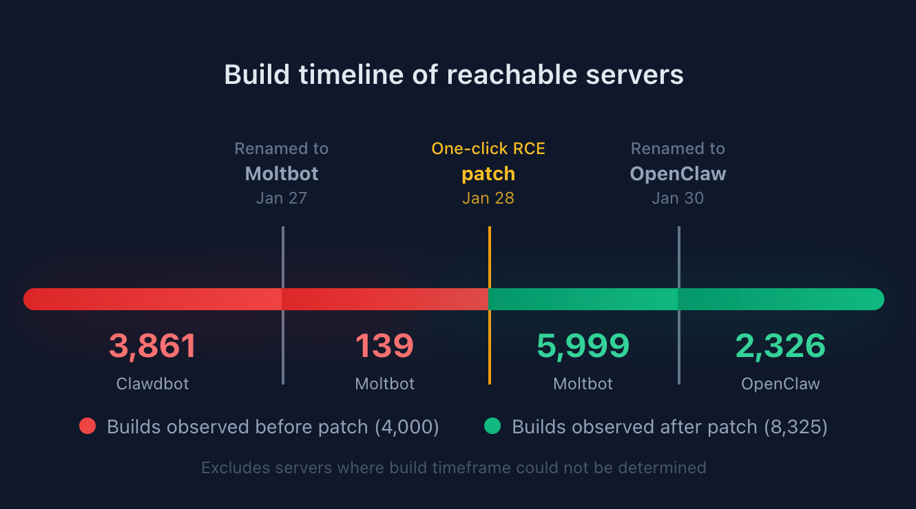 By extracting the content-hashed filenames Vite generates for bundled JavaScript and CSS assets, we were able to fingerprint exposed servers and correlate them to specific builds or version ranges. This analysis shows that roughly a third of exposed OpenClaw servers are running versions that predate the one-click RCE patch.