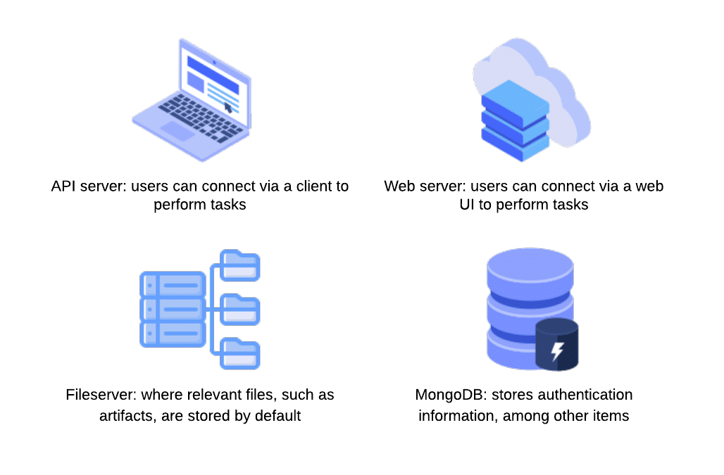 The ClearML Server is a central hub for managing projects, datasets, tasks, and more. It consists of multiple components, including an API server that users can connect to via a client to perform tasks; a web server that users can connect to via a web UI to perform tasks; a fileserver where relevant files, such as artifacts and models, are stored by default; and a MongoDB instance, that stores authentication information, among other items.