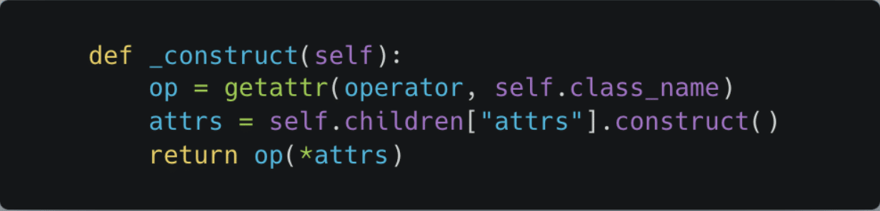 }Because we can load functions into memory, if we are able to call them with the arguments that we want we can then exploit the loading system. This occurs in the compilation of a OperatorFuncNode node: