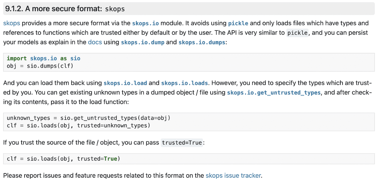 }When loaded with the trusted parameter set to True or setting the trusted types to all unknown types, this then executes the code and returns None. In the tutorial for how to use the library (scikit-learn documentation) both examples would allow for code execution: