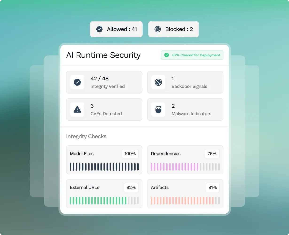Scan model files and URLs for malware, CVEs, backdoors, and integrity issues before deployment.