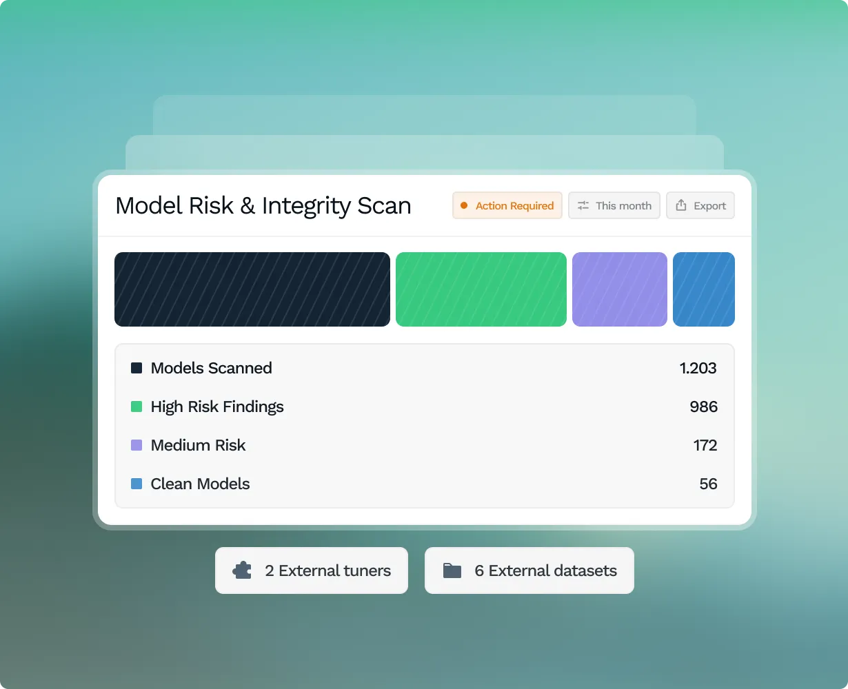 Scan proprietary, vendor, and open source models for malware, backdoors, CVEs, integrity issues, and inherited risk before models reach production.