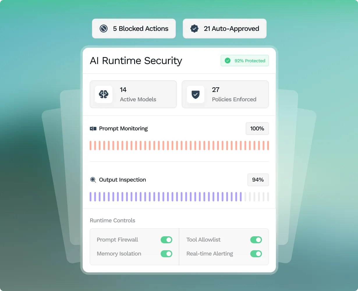 Monitor prompts, outputs, memory, and agent actions in real time to detect and block prompt injection, data leakage, model theft, and unsafe tool use.