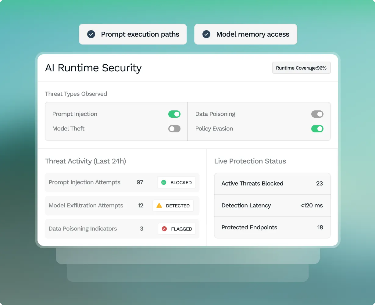 Detect and block model theft, data poisoning, and prompt injection in real time with native SIEM integration and contextual alerting.